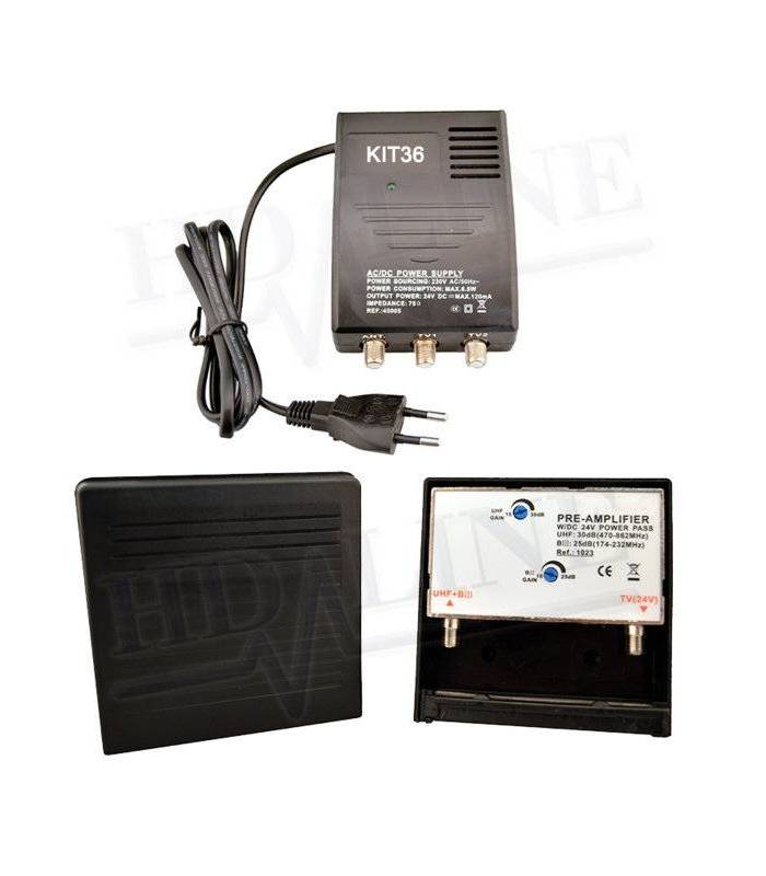 Kit d amplification TNT HD LINE KIT 36 UHF et VHF composé d'un préamplificateur de mat réduisant les parasites et d un amplificateur d'intérieur destiné à amplifier le signal TNT sur 2 postes TV