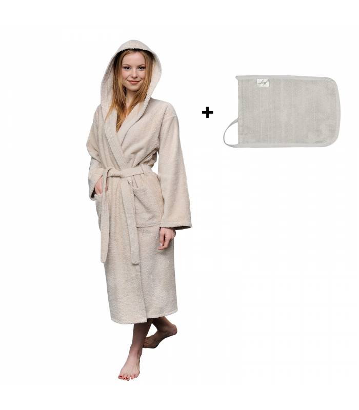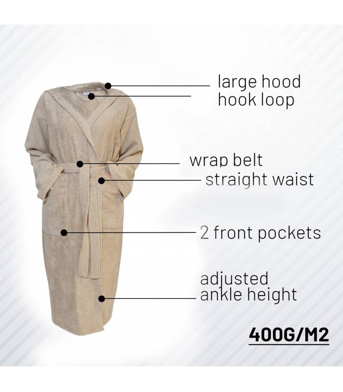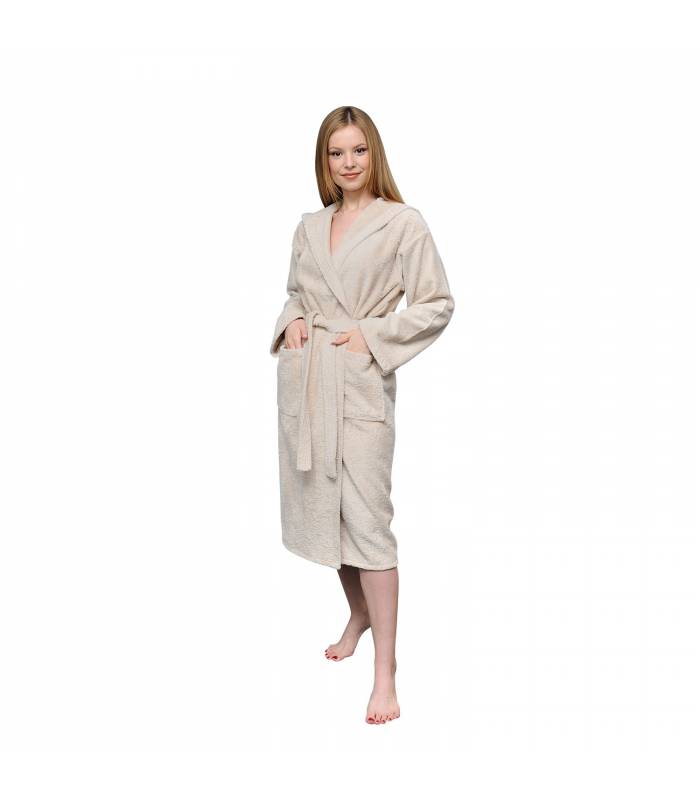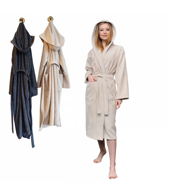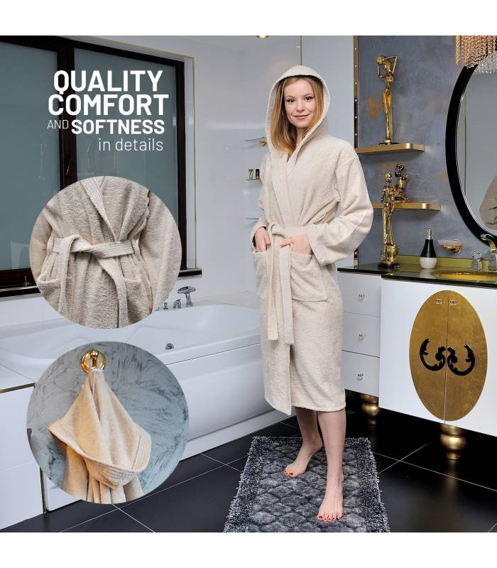 Sentez-vous absolument en sécurité dans ce peignoir pour femme à manches longues et capuche, 2 poches, ceinture (2 passants) et col V en boucle en 100% coton original de haute qualité (400 g). Apparence: Doux et durable, chaud et super absorbant. Il offre une utilisation confortable.